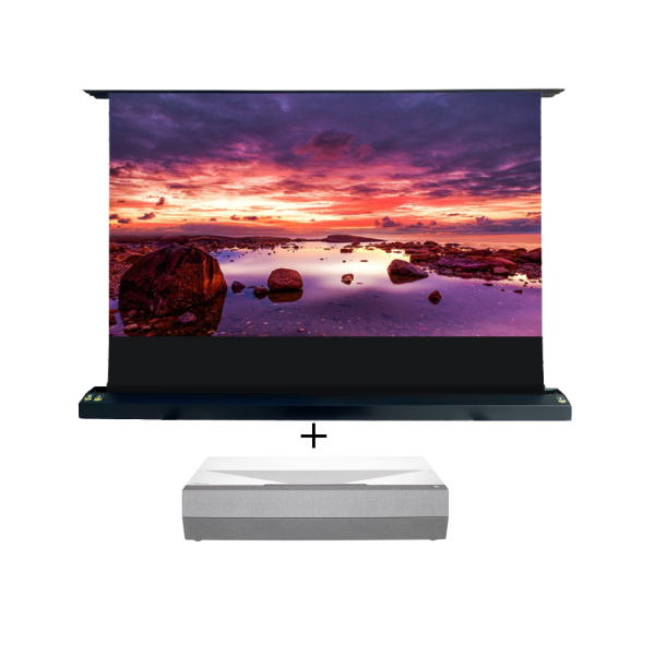 This Bundle includes a EluneVision Aurora 8K Motorized Tab Tension Ultra Short Throw Floor Rising ALR Screen of your choice coupled with the Optoma CINEMAX-D2-W 4K UHD Ultra Short Throw Laser Home White Projector.