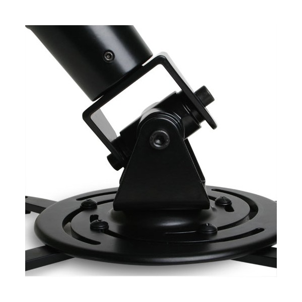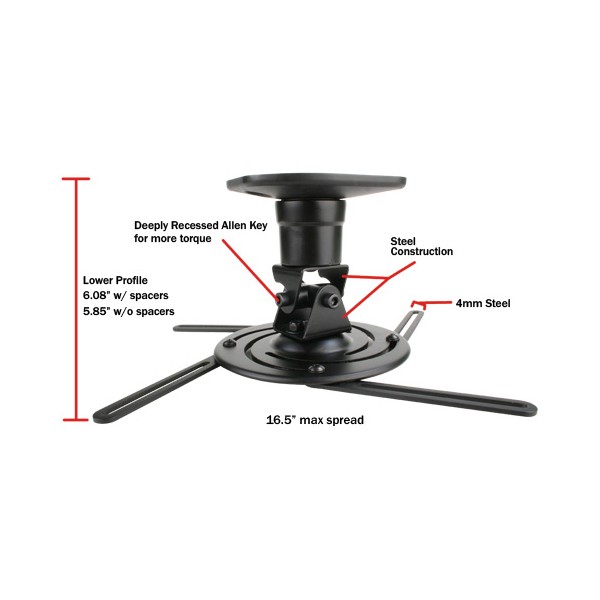 This mount’s 4-mm. thick steel arm screams durability, while its 16.5″ wingspan offers many possibilities. The slot down the middle ensures universal mounting possibilities that can get as creative as you do. For installation, the ceiling plate gets installed first and then the body and projector slide into place. A spring loaded-locking screw allows for easy finger tightening, locking the two together.