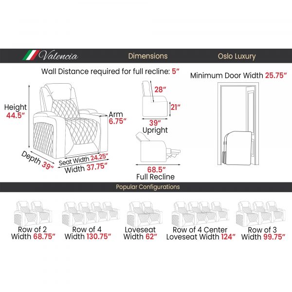 Fall into the lap of luxury with the 2025 New Oslo Luxury. Lending itself to the masterful movie maven or seasoned audiophile, the New Oslo will take you to new heights of enjoying your chosen entertainment. The timeless double diamond french stitching inlaid to the Italian matte semi-aniline 20,000 nappa leather exudes luxury in any space it is placed into. Ensuring no detail was left behind… you can expect to experience a quiet motorized headrest, lumbar and recline. To truly make the 2025 New Oslo fit into any aesthetic, 7 cycle RGB LED lights illuminate the cup holders and base of each seat. Coming equipped with an unobtrusive controller panel, USB-A and USB-C charging ports for all devices.