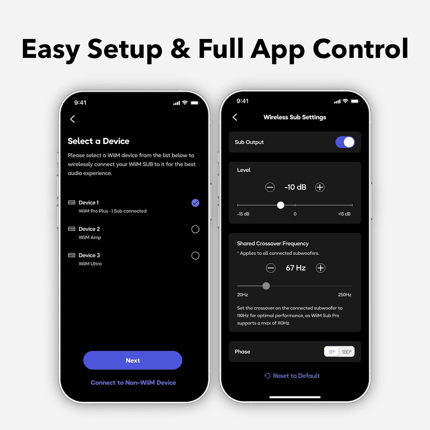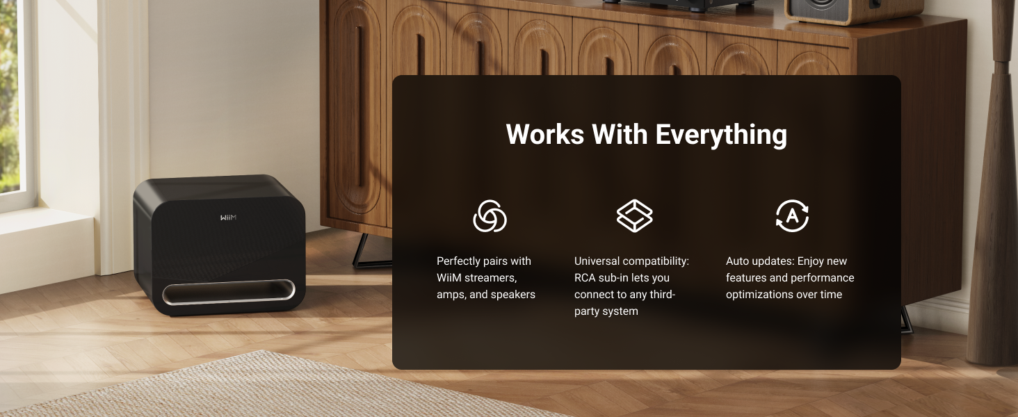 You can connect wirelessly to WiiM streamers, amplifiers, and speakers, or use the RCA input for any third-party device with a subwoofer output.