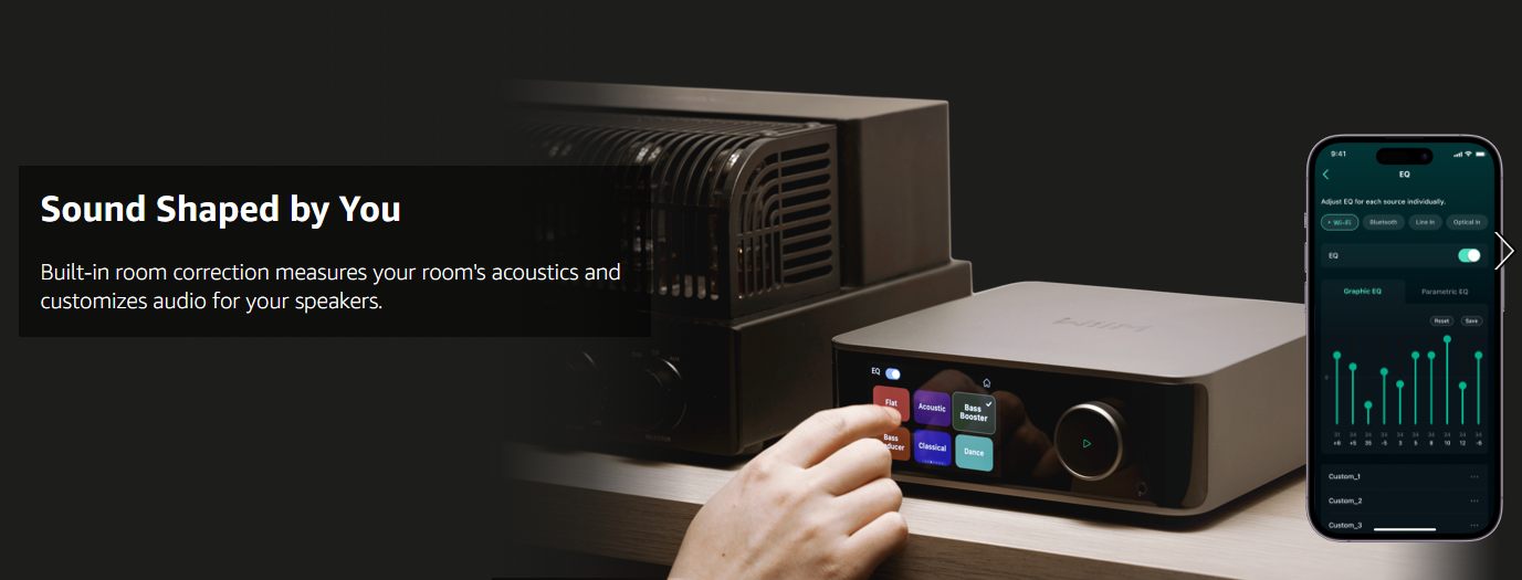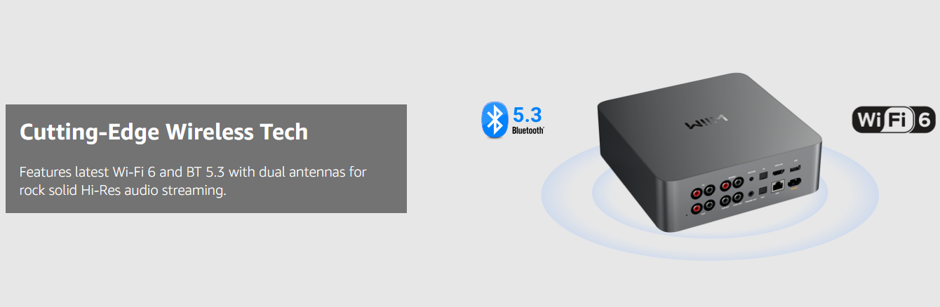 • Bluetooth 5.3: Supports A2DP receiver and transmitter, AVRCP, HID, and works with the WiiM voice remote​​