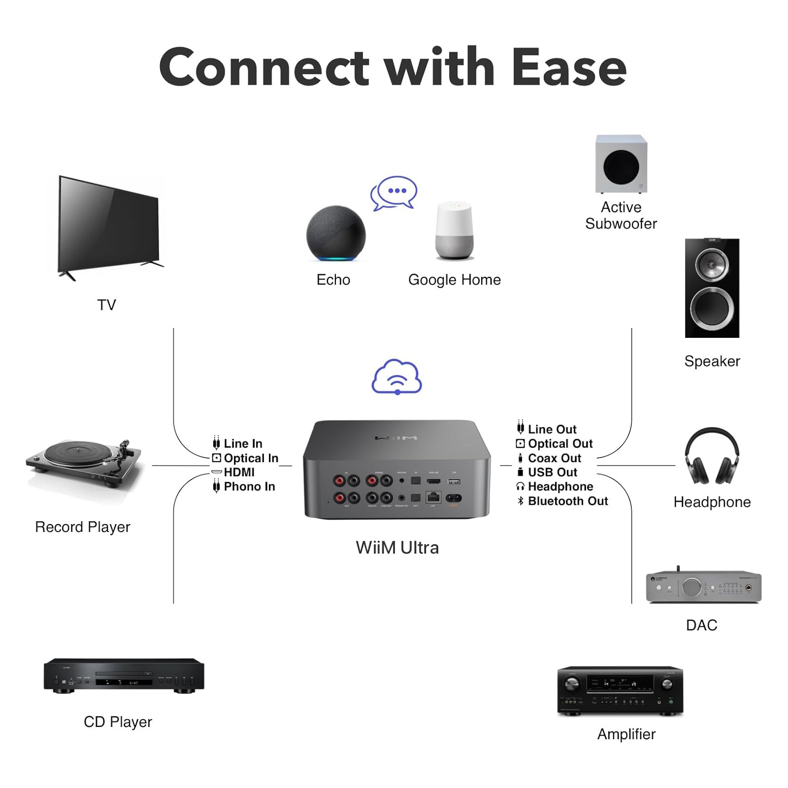 The WiiM Ultra redefines your audio experience by bringing Hi-Res streaming capabilities, advanced room correction, and smart home integration to your existing setup, be it powered speakers or amplifiers. It seamlessly connects with a wide range of devices, offering a versatile audio solution.